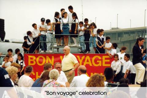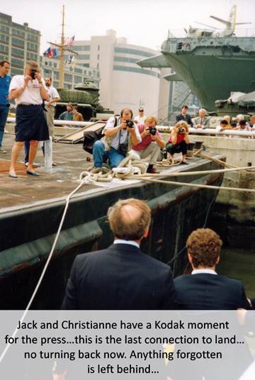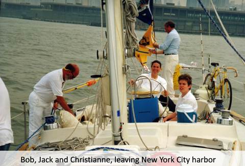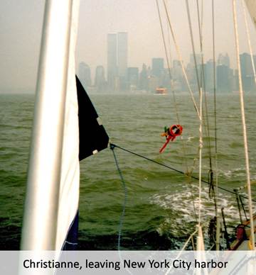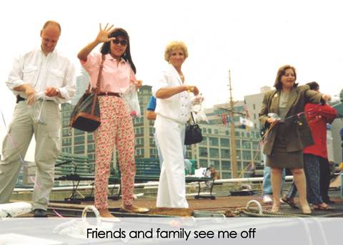 The Christianne was representing New York State in what was called the “America 500”: 500 sailboats that would trace Chris’s trip from Spain to the New World 500 years later. Because of this, we got quite a send off: The Intrepid Sea/Air/Space Museum (formerly aircraft carrier) hosted it, attended by the Deputy Mayor of NYC (in brown throwing confetti), the Governor’s assistant, and several other City and museum officials. The program included the requisite speeches, and several choral numbers by local schools. It was attended (in the photo in order left to right) by a high school buddy named Rich, a girl friend named “Girlie” in pink and my Mom (Dad was there too somewhere). There were photographers, even a chase boat. It was quite the occasion, culminating in our departure, pushing off to face an uncertain voyage: none of us had ever gone this far…