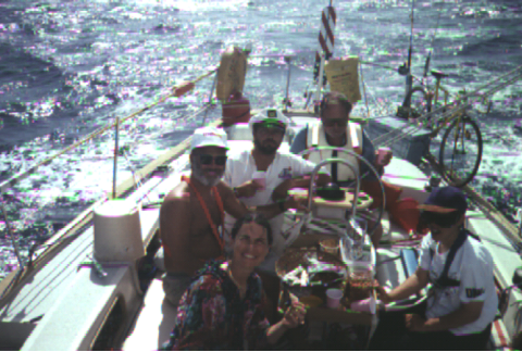 A cool breeze blows over the starboard rail. The sails are trimmed fairly well (great for this crew). I feel a little cool in my Max’s Diner T-shirt and my omnipresent green late‑movie swim trunks. Today is my turn to cook. I feel we are really under way today. Things have settled down, and the winds have picked up. I am making fewer suggestions about sail trim, and my meals were not spicy, to everyone’s relief. The pizza that I made for lunch is sitting in my belly, and my belly is saying that there might have been some cheese or something that it didn’t really like that much.